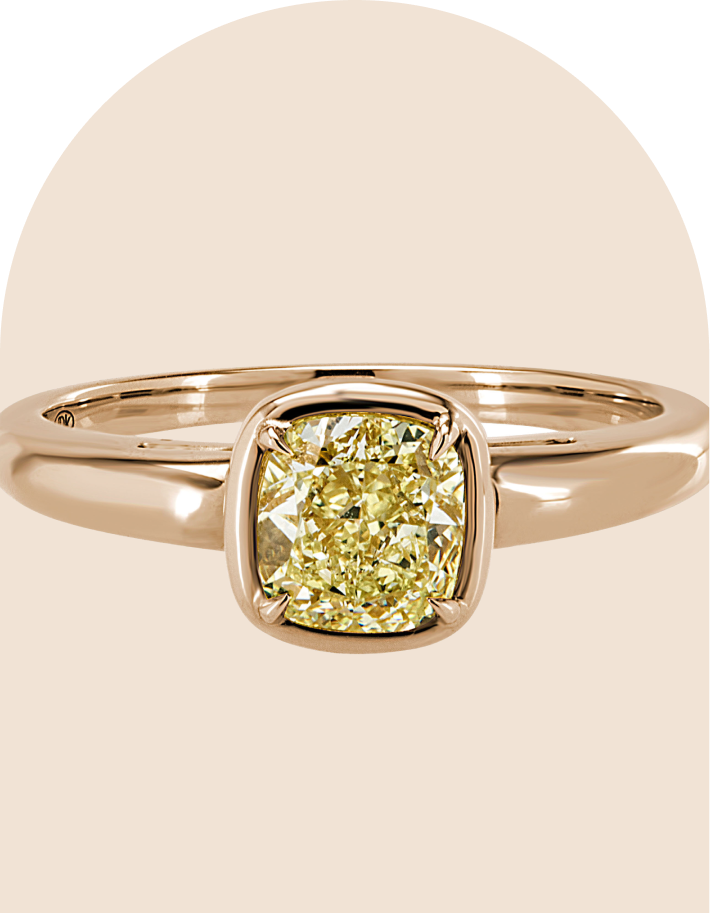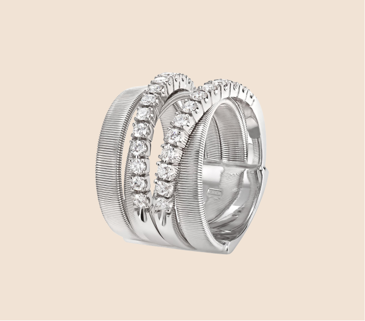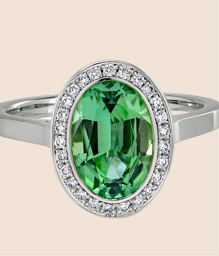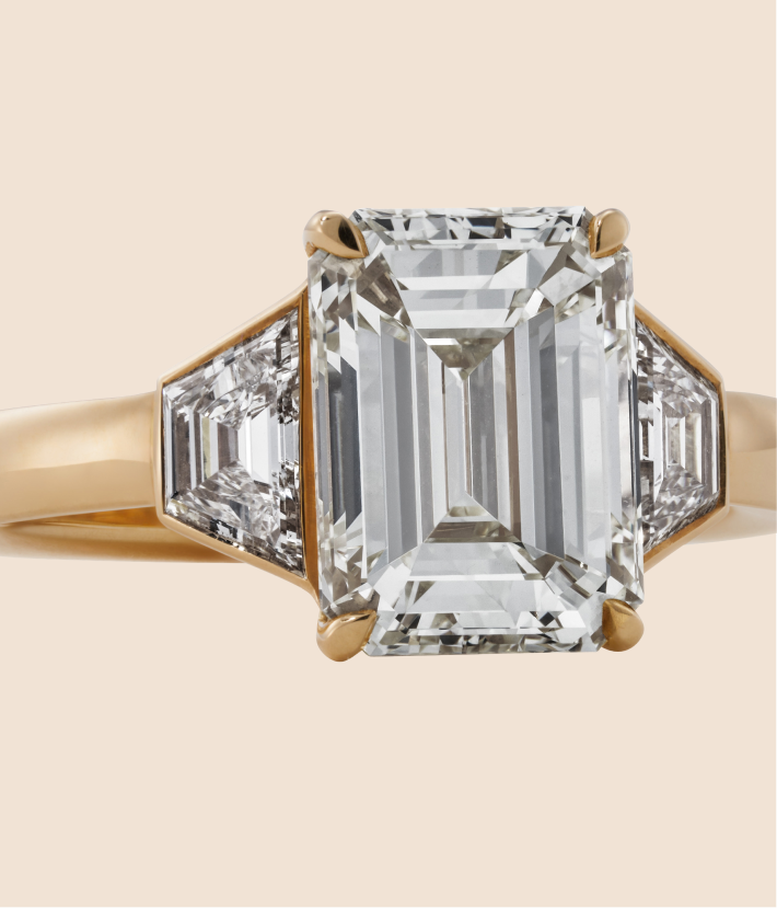Ringens design er enkelt og minimalistisk, hvilket understreges af de 18 smaragd-slebne diamanter, der på enkleste og minimalistiske måde reflekterer lyset.