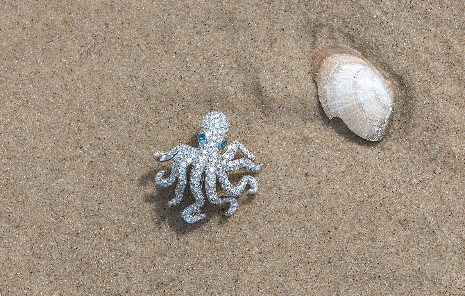 Ved Skagens kyst, hvor to have mødes og horisonten aldrig står stille, opstår en særlig ro – og en dyb forbindelse til havets kraft og mystik. Skadi er født af netop denne stemning: en hyldest til havets hemmelige liv og det lys, der danser over sand og vand. Denne blækspruttebroche er udført i hvidguld og pavébesat med et væld af diamanter, der fanger lyset, som solreflekser på Kattegats bølger. Øjet – sat med en safirblå ædelsten – skaber et intenst blik, mens de yndefulde arme snor sig i en form, der næsten bevæger sig med vinden, som den føles i klitterne omkring Grenen. Skadi er ikke blot et smykke – det er en fortælling. Om Skagen. Om havets dyb. Og om styrken i det stille og det sanselige.