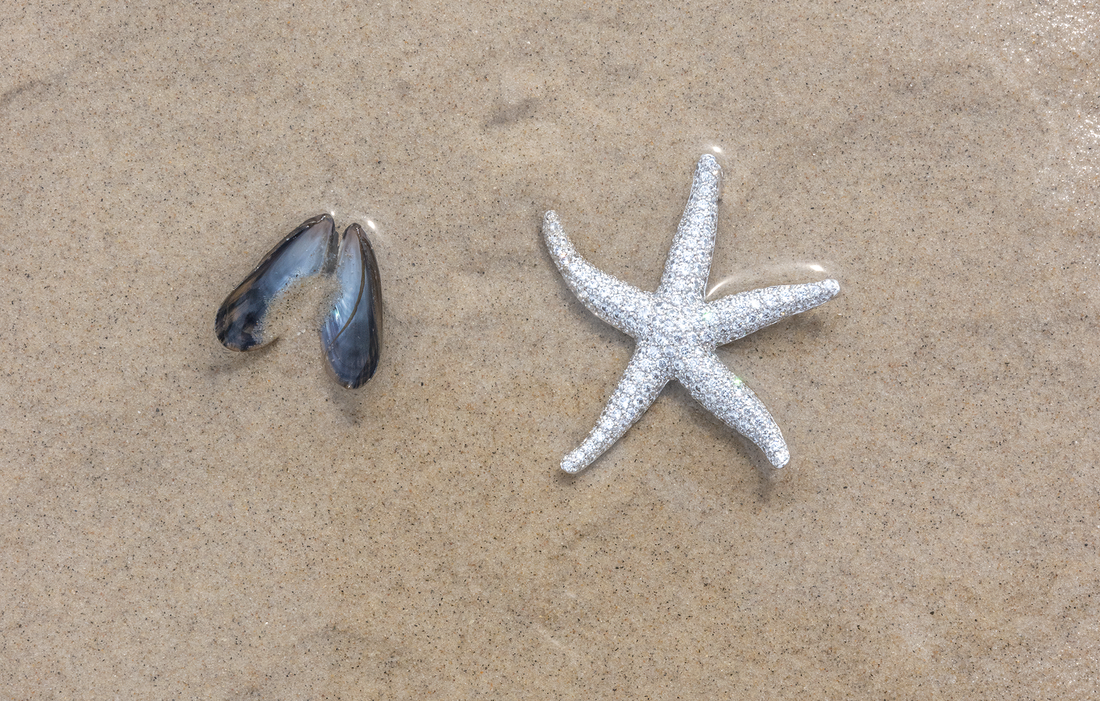 En tidlig morgen i Skagen. Havet trækker sig sagte tilbage, og i det våde sand ligger en søstjerne – som et stille vidne om nattens bevægelse. Den er hverken fundet eller glemt – den er bare der. Nærværende. Naturlig. Fuldkommen. Denne broche indfanger det øjeblik. Søstjernens organiske form er genskabt i hvidguld og pavébesat med diamanter, der glimter som havets første lys. Den let asymmetriske silhuet gør hver arm levende – som om den stadig husker bølgens rytme. Et smykke for den, der elsker havet uden at råbe det højt. For den, der kender kraften i det stille.